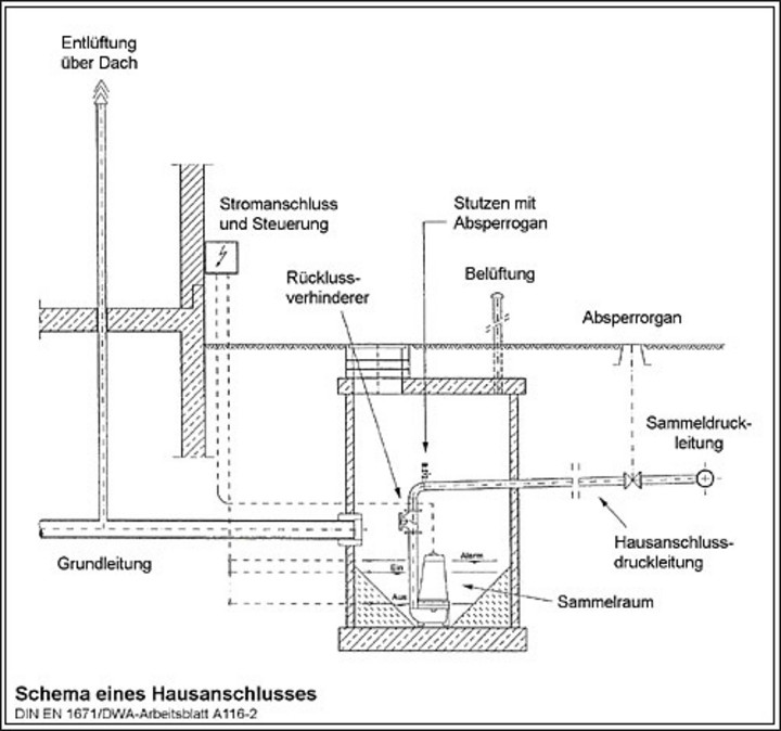 Hauspumpstation mit Grundstücksanschluss, öffentliche Entsorgungsleitung als Druck- oder Freigefälleleitung, Spüleinrichtung, ggf. Hauptpumpwerk und Ableitung zur Kläranlage.
